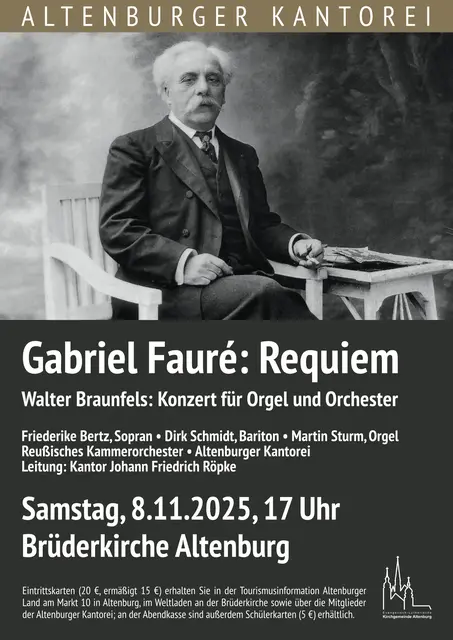 Die Altenburger Kantorei musiziert zum Ende des Kirchenjahres das Requiem von G. Fauré und das Konzert für Orgel und Orchester von W. Braunfels. Faurés Requiem beeindruckt mit seiner Schlichtheit und dabei himmlisch anmutenden Melodiebögen und führt zum Ende des Kirchenjahres mit versöhnlichen und tröstenden Klängen die Zuhörer in den Themenkreis Sterben, Ewigkeit und Gedenken ein. W. Braunfels Konzert wird nur sehr selten aufgeführt. Der Grund ist keinesfalls in der Qualität der Musik zu finden, sondern darin, dass Braunfels vom NS-Regime verfolgt und zum Schweigen gebracht wurde. Dadurch geriet seine Musik lange in Vergessenheit. Den Orgelpart übernimmt der international gefragte Organist Martin Sturm. Er ist Professor für Orgel in Weimar und einer der besten Kenner der mitteldeutschen Orgellandschaft. Er wird die bedeutende Sauer-Orgel der Brüderkirche auf virtuose Weise zum Erklingen bringen und den Zuhörern das Instrument noch einmal auf ganz andere Art und Weise vorstellen. So ergibt sich ein außergewöhnliches und sehr hörenswertes Konzerterlebnis. Die Orchesterbegleitung übernimmt das Reußische Kammerorchester, als Solisten sind Friederike Bertz (Sopran) und Dirk Schmidt (Bariton) zu hören. Die musikalische Leitung hat Kantor Johann Friedrich Röpke inne. Karten erhalten Sie im Vorverkauf in der Tourismusinformation Altenburger Land, im Weltladen an der Brüderkirche, über Mitglieder der Altenburger Kantorei sowie an der Abendkasse.