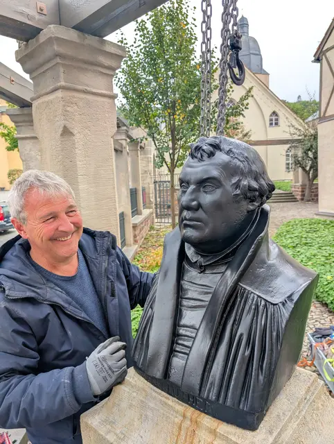 Die Restaurierung der historischen Büste des Reformators Martin Luther vor dem Museum „Luthers Geburtshaus“ in Eisleben ist abgeschlossen. Die Eisengussbüste aus dem Jahr 1817 wurde in den vergangenen sechs Monaten in der Werkstatt Dempwolf in Berlin neu beschichtet und ist nun an ihren angestammten Platz zurückgekehrt. Ermöglicht wurden diese Arbeiten, die rund 8.000 Euro gekostet haben, durch Spenden des im vergangenen Jahr verstorbenen Kunstmäzens Prof. Dr. Jürgen Krüger.
