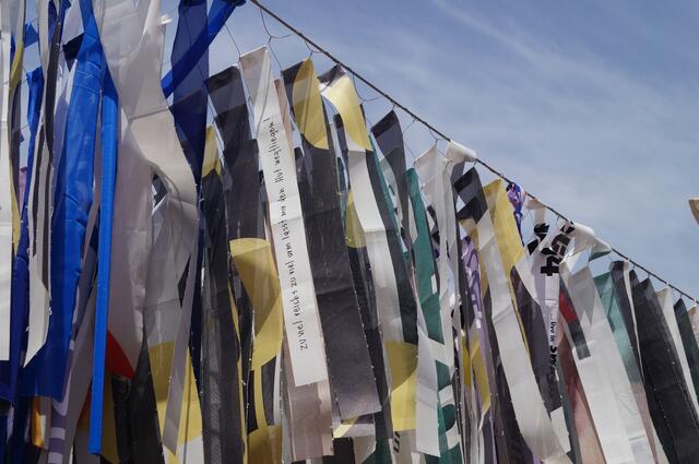 Den ökumenischen Kirchenpavillon findet man hier im Möglichkeitsgarten. Schon von weitem fallen die bunten Stoffbahnen auf, die immer in Bewegung sind und das Kirchendach bilden. Der Stoff dafür stammt von Werbefahnen des letzten Katholikentages (2022 in Stuttgart). Auf viele der daraus geschnittenen Streifen haben Menschen bei Gottesdienstbesuchen und Festen vermerkt, was ihnen wichtig ist.