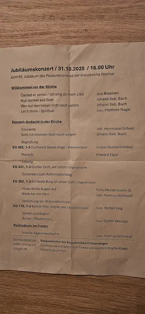 ... lobe den Herrn! Halleluja! (Psalm 150, Vers 6) – So ermutigt die Urkunde von Landesbischof Friedrich Kramer und der EKM zum 50-jährigen Jubiläum des Posaunenchores der Kreuzkirche in Weimar. Die ehrenamtlich aktiven Mitglieder des Posaunenchores musizierten am Reformationstag mit Ehemaligen unter Leitung von Kantorin Brigitte Kliegel (ab 2003) und Landesposaunenwart KMD Frank Plewka. Volle Känge erfüllten die Kirche zur Jubiläums-Konzert-Andacht – von Johann Sebastian Bach, Gustav...