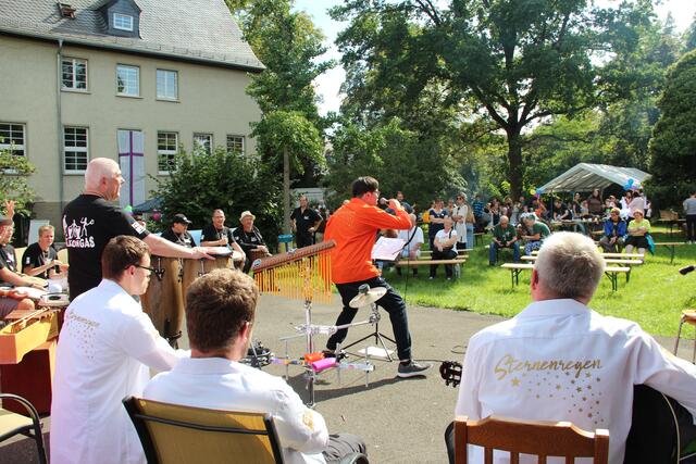 Anschließend erfüllte dich der ganze Festbereich mit leben, im Kindergarten-Garten, der beinahe wie ein Dschungel wirkt, grün und bunt, mit Pflanzen und Bäumen, Spielgeräten, Matschstrecke und zwischendrin Stationen zum Mitmachen und Entdecken. Im Gemeindehausgarten gab es Kaffee und Kuchen, Eis, Christo-Fladen, kühle Getränke und Bratwurst. Die Band Sternenregen und die Trommelgruppe Kongas begeisterten die Gäste mit Musik. Der Stand der Sängerknaben, die Partnerschaft für Demokratie und schließlich ein Theaterauftritt der Frauen und Männer der Besonderen Wohnformen in der Brudergasse sorgten für Abwechslung und gute Unterhaltung bis das Fest am Lagerfeuer mit Musik und Abendsegen Ausklang.