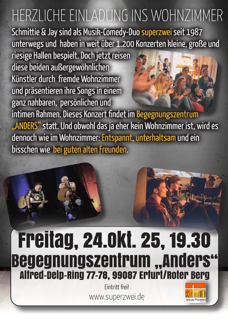 Am 24. Oktober findet unser nächster Primetime-Abend statt. Dieses mal mit dem bekannten Musik-Comedy-Duo SuperZwei aus Hessen. Schmittie & Jay sind seit 1987 unterwegs und haben in weit über 1.200 Konzerten kleine, große und riesige Hallen bespielt. Doch jetzt reisen diese beiden außergewöhnlichen Künstler durch fremde Wohnzimmer und präsentieren ihre Songs in einem ganz nahbaren, persönlichen und