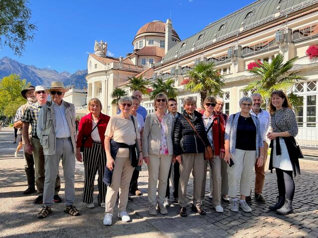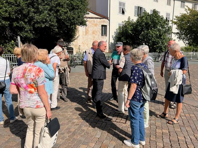 Für die anschließende Stadtführung erklärte sich Altbürgermeister Dr. Paul Rösch bereit und führte die Gäste durch die schöne Passerstadt. Dabei war die Entwicklung zur Kurstadt ebenso Thema, wie die Geschichte der Protestanten in Südtirol.
