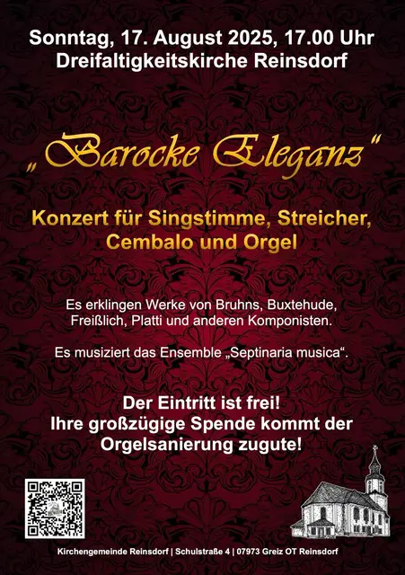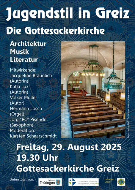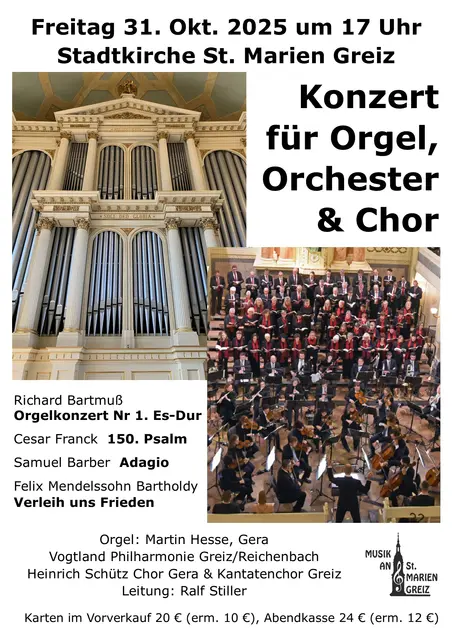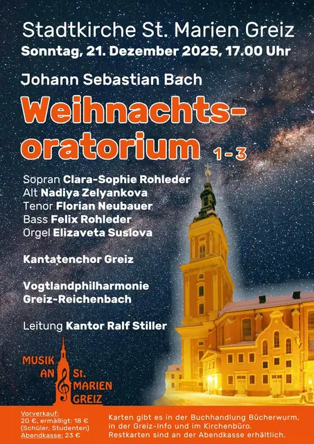 Sopran Clara-Sophie Rohleder Alt Nadiya Zelyankova Tenor Florian Neubauer Bass Felix Rohleder Orgel Elizaveta Suslova Kantatenchor Greiz Vogtlandphilharmonie Greiz-Reichenbach Leitung Kantor Ralf Stiller Karten gibt es in der Buchhandlung Bücherwurm, in der Greiz-Info und im Kirchenbüro.