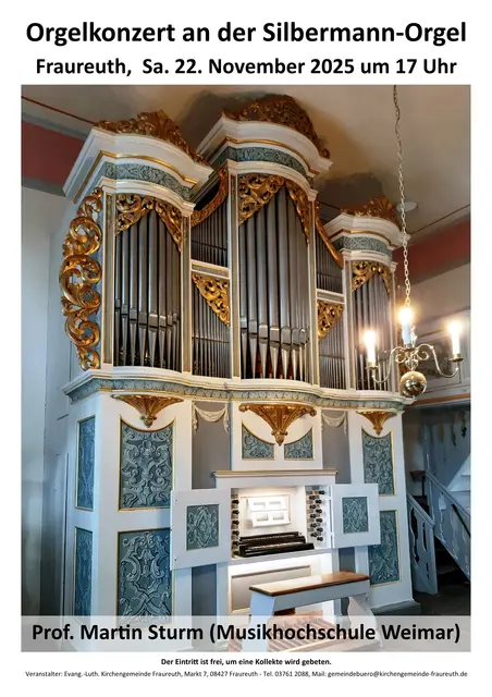 Hiermit möchte ich auf ein ganz besonderes Konzert, hinweisen: am Samstag, 22.11.25 um 17 Uhr, wird Prof. Martin Sturm von der Weimarer Musikhochschule "Franz Liszt" an der Silbermann-Orgel in Fraureuth spielen. Prof. Sturm ist ein musikalisches Genie und er ist für mich der beste Organist, den ich kenne! Dieses Ereignis, ihn an der Silbermann-Orgel in Fraureuth zu erleben, sollten Sie sich nicht entgehen lassen! Herzliche Grüße, Ralf Stiller