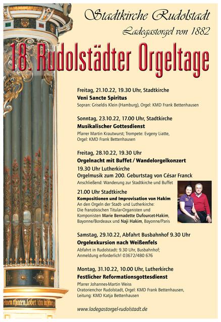 Es ist uns eine ganz besondere Freude, dass wir zu den Orgeltagen Marie-Bernadette Dufourcet-Hakim und Naji Hakim nach Rudolstadt einladen konnten! Beide sind als Konzert-Organisten, Improvisatoren und Komponisten international gefragte Künstler. Naji Hakim hat vor zwei Jahren schon das Publikum mit seiner Virtuosität und Spielfreude in der Stadtkirche begeistern können. Wir kommen bei den diesjährigen Rudolstädter Orgeltagen in den seltenen Genuss, die beiden auch gemeinsam musizierend zu erleben. Vor 200 Jahren wurde in Lüttich der Komponist César Franck (1822-1890) geboren. Die beiden Konzerte zur Orgelnacht sind eine Hommage an César Franck, machen neugierig auf Musik von Hakim und bieten auch wieder Raum für Improvisationen über Zuhörerwünsche. Unbedingt weitersagen!