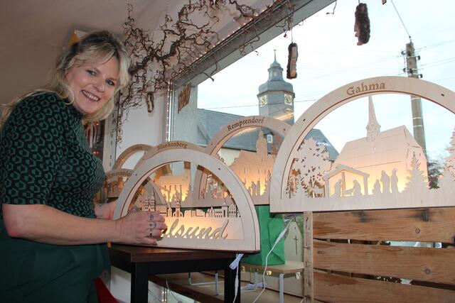 "In Remptendorf und den umliegenden Orten wird Kirmes gefeiert, bald ist Reformationstag. Das sind Feste der Kirche, deshalb haben wir entschieden, die Schwibbögen schon jetzt im Schaufenster auszustellen. Wie gut das ankommt, überrascht uns", sagt Melanie Wolf. Sie und ihr Mann Christian haben mittlerweile mehr als 30 Motive im Angebot. Sie freuen sich über das Interesse. Menschen kommen in den Laden, um sich umzusehen, sind erfreut von der Idee und der Vielfalt. Neu sind zum Beispiel Gahma, Neuenbeuthen, Neundorf, Volkmannsdorf, Gössitz und Hirschberg, die in der Schreiner von Philipp Stich in Oberböhmsdorf entstehen. Ständig kommen neue dazu, wenn Bestellungen vorliegen.