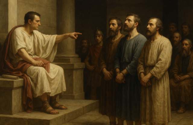 Dann die Wachen. Hinter den Dreien stehen sie da, halb gelangweilt, halb gespannt, und der Richter, der sich in der Pose des Gerechten gefällt, hebt die Hand und spricht ein Urteil, das schon vor Tagen beschlossen war, vielleicht schon vor Jahren, als das Reich beschlossen hatte, dass Menschen, die an etwas glauben, das man nicht sieht, nicht ins System passen.