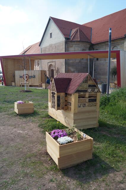 Zwei große Parks, mit einer Seilbahn verbunden, bilden das Buga-Areal. Während der eine Teil, der Luisenpark ein alter, gewachsener Park ist, der schon eine Gartenschau kannte und nun natürlich noch für den Anlass aufgehübscht wurde, ist das bei dem "Spinelli-Gelände" anders. Hier handelt es sich um eine alte Militärkaserne. Diese Umwandlung in einen friedlichen Blumenpark ist schon an sich symbolträchtig. Ein weiteres Friedenssymbol ist der Tisch der Nationen, ein Stuhlprojekt, bei dem 193...