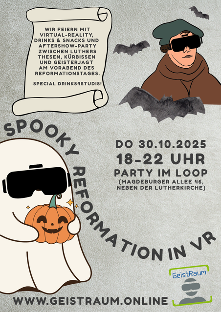 Was haben Luthers Thesen, Geisterjagd und Kürbisse miteinander zu tun? Im GeistRaum gehen wir dem Zusammenhang zwischen Reformation und Halloween auf den Grund bei „Spooky Reformation in VR“ am Donnerstag, 30.10.2025 in der Zeit von 18 bis 22 Uhr bei einer offenen Freeflow-Party im Loop (Magdeburger Allee 46, neben der Lutherkirche). Wir feiern mit Virtual-Reality, Drinks & Snacks und AfterShow-Party zwischen Luthers Thesen, Kürbissen und Geisterjagt am Vorabend des Reformationstages. Für...